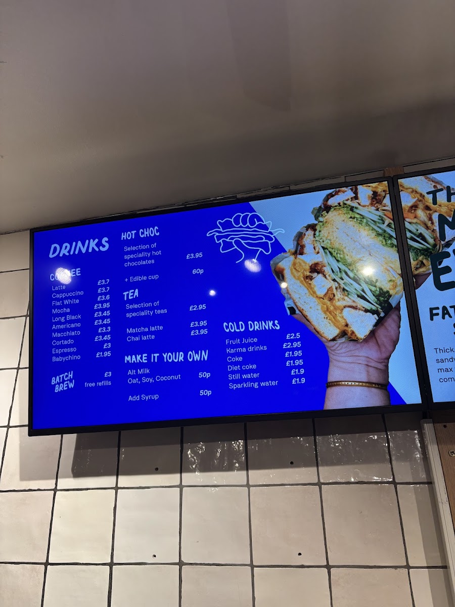 Kneaded prides itself on its exceptional menu, featuring a variety of beverages that cater to all tastes. Start your day off right with a vibrant Tropical Green smoothie or enjoy a blissful afternoon with the indulgently creamy Coco Loco. For those looking for an energizing boost, the Exotic Energy smoothie is sure to become a favorite. The cold drinks selection, such as refreshing fruit juices and Karma Drinks, are ideal companions for a sunny day. With prices ranging from £1.90 to £2.95, there’s something for everyone’s budget.